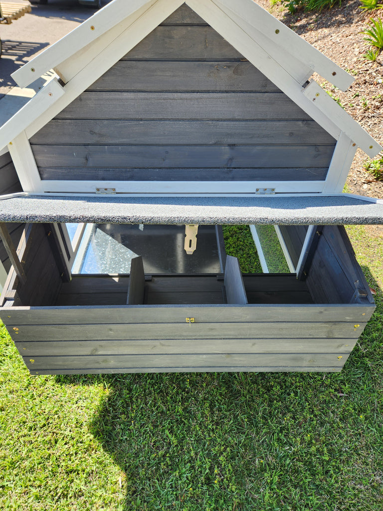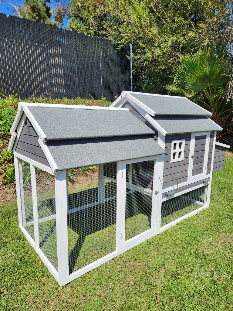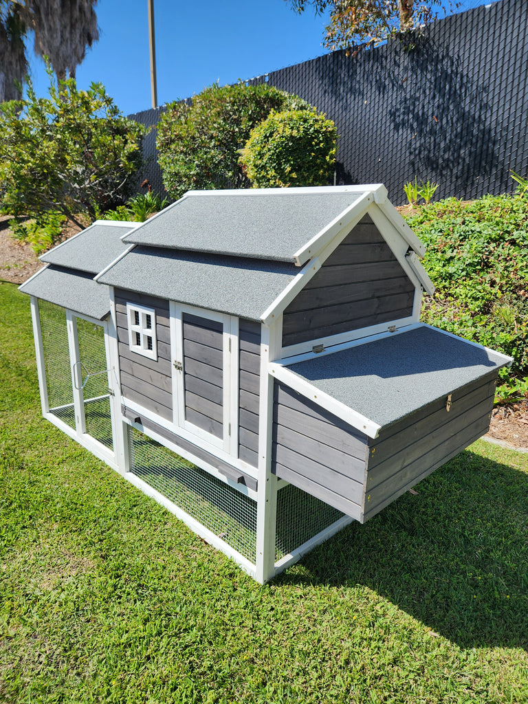 The Cheyenne Chicken Coop is perfect for the small backyard poultry enthusiast. Measuring 76” x 36” x 52”, it is just the right size for 2 or 4 chickens pending their size. Features a designer style twin level roofs & 2 roosting bars inside for your birds comfort. It also has 3 nesting boxes with outside access for collecting eggs and easy pull out tray for cleaning.
