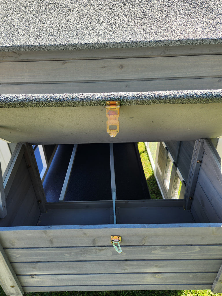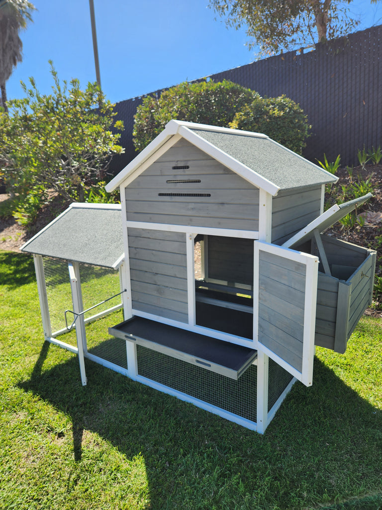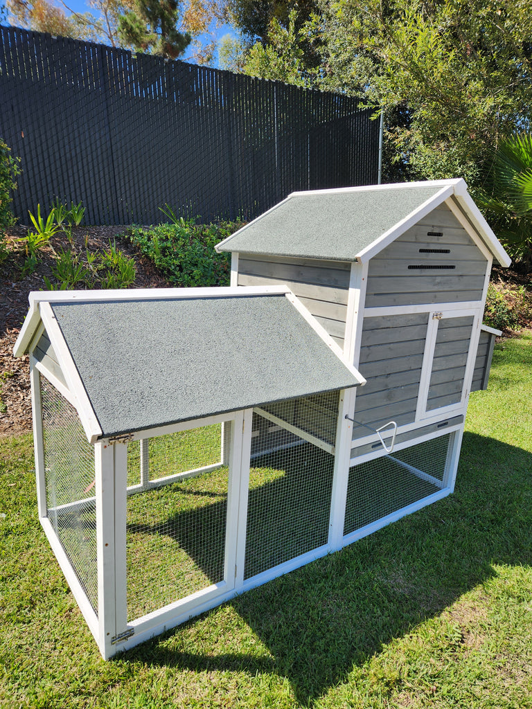 The Rugged Ranch Raised Wood Chicken Coop is made with naturally rot and pest resistant solid fir. This coop comes with a large, dual nesting box and two built-in roosting perches. The top access door allows for easy egg collection. It also comes with a pull-out tray for cleaning. This coop is great for housing chickens, rabbits, and cats.
