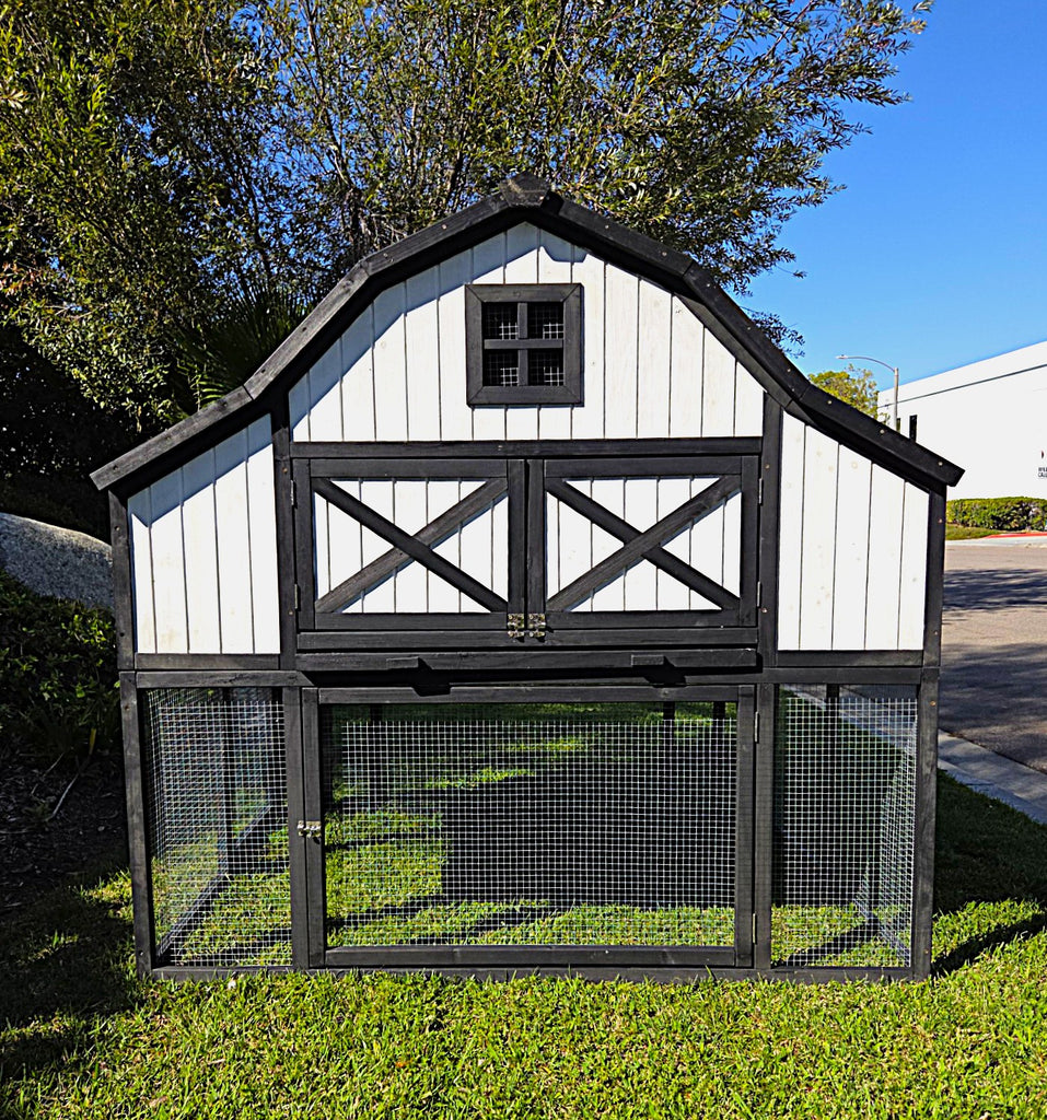 DESCRIPTION: The Rugged Ranch Omaha Chicken Coop features easy access doors and a lower foraging level. Looking great with a barn-inspired design, the coop gives your chickens plenty of space to relax in. 4 nesting areas offer ample grounds for egg laying, and you can easily harvest your crop with the large, easy-access doors. Your chickens can walk down the ramp to the lower level, where they can forage for food and enjoy fresh air. The wire door on the bottom level lines up perfectly with the knock-out panel on Rugged Ranch wire pens, allowing you to link the pen to your coop to provide extra space and safety. Made from solid wood, the coop resists the elements to keep your animals safe and dry. This coop gives your laying hens the perfect place to stay right in the comfort of your backyard. We recommend regular maintenance of applying weather resistant protection and place Chicken Coop in covered area to minimize wear and tear.